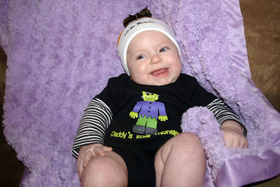 I got the girls all cute halloween shirts. This one says "daddy's little monster", so I had to get it, even though it isn't very girly. so I clipped a bow on her hat.
